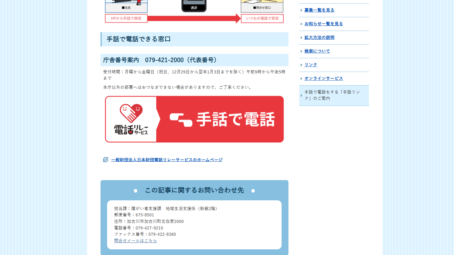 4.手話通訳オペレーターが、加古川市役所代表番号へ電話をつなぐので、問い合わせ内容を伝える。問い合わせ内容に応じて、代表番号から各担当課へと電話がつながる