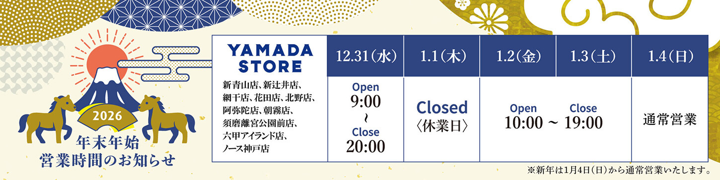 12/31は10:00~18:00、1/1~1/4まで休業です。1/5からは通常営業(10:00~20:00)。