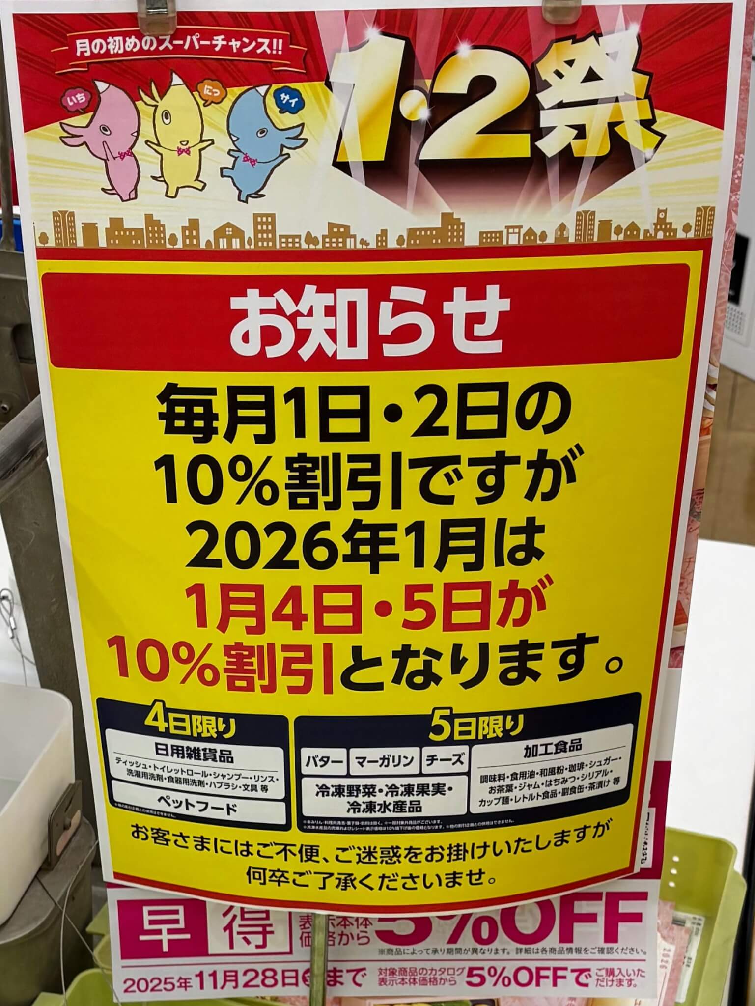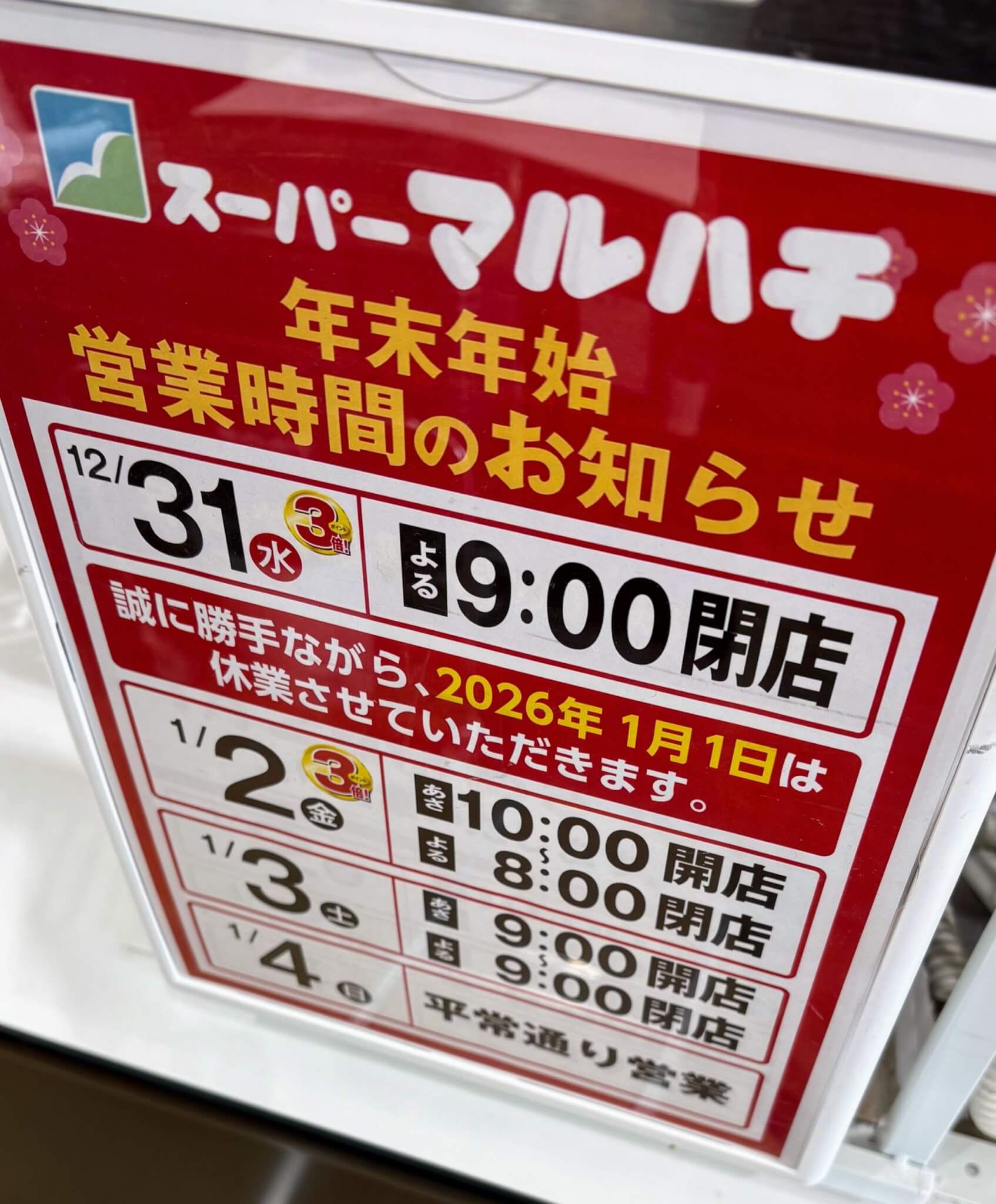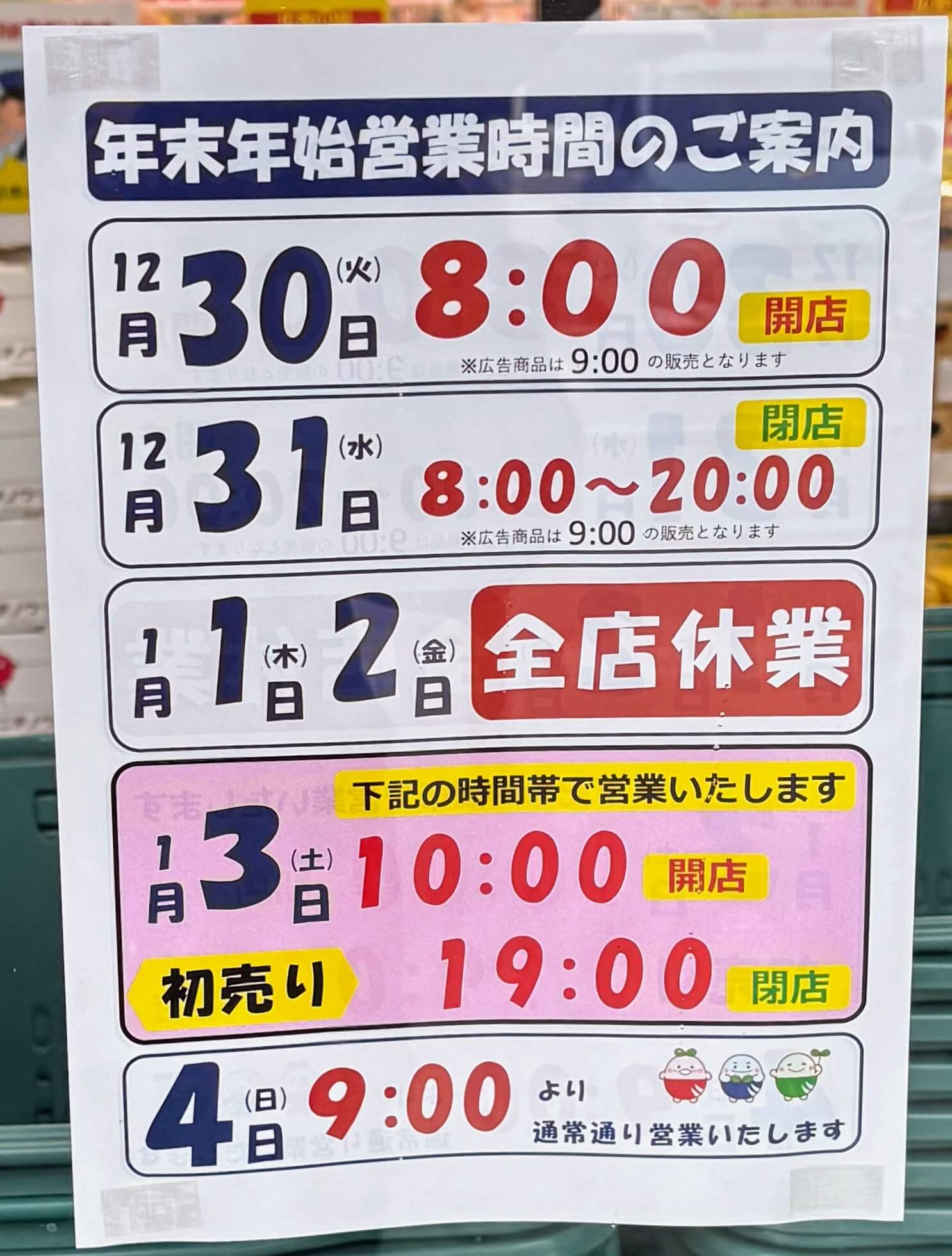 1月3日4日あたりまでは休業となるスーパーもあるので、お買い物の際はご注意ください!