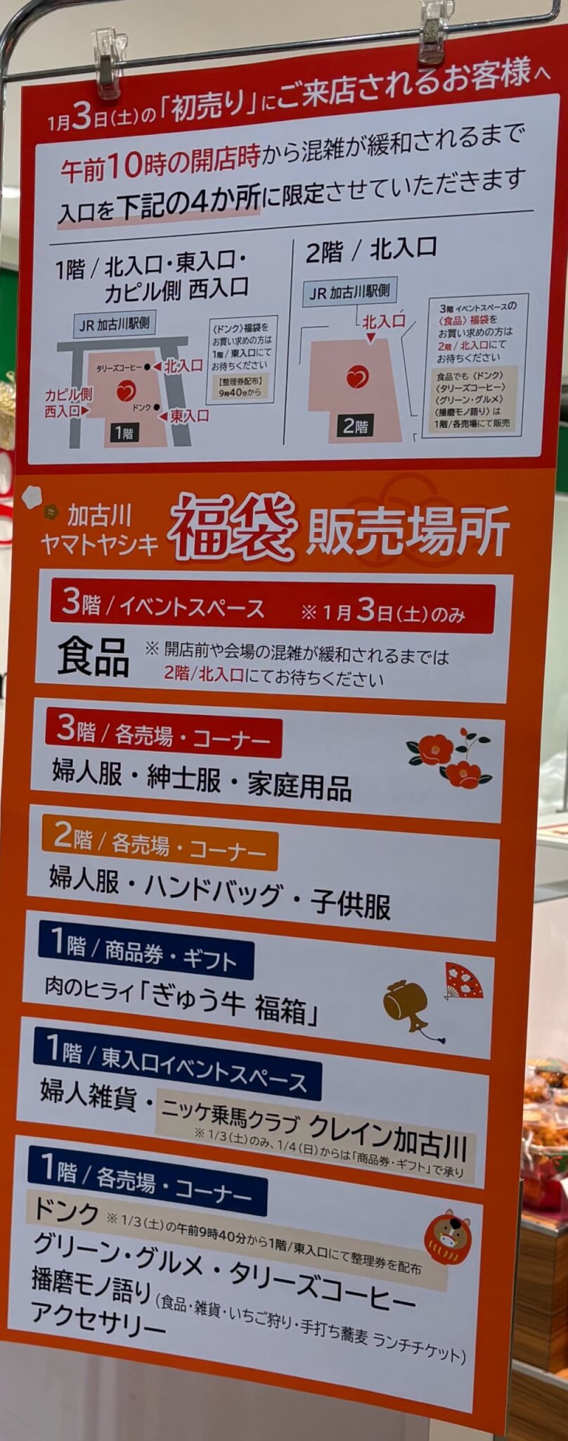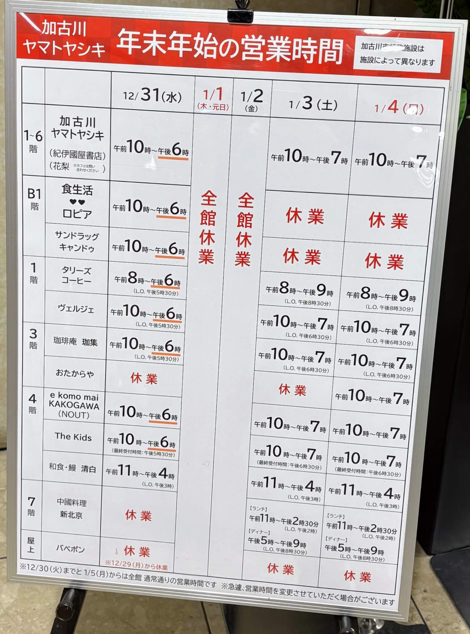 ヤマトヤシキ地下の加古川駅前店は1/1~1/4休業ですが、東加古川店・加古川安田店・加古川粟津店は1/1のみ休業。営業時間短縮もあります。