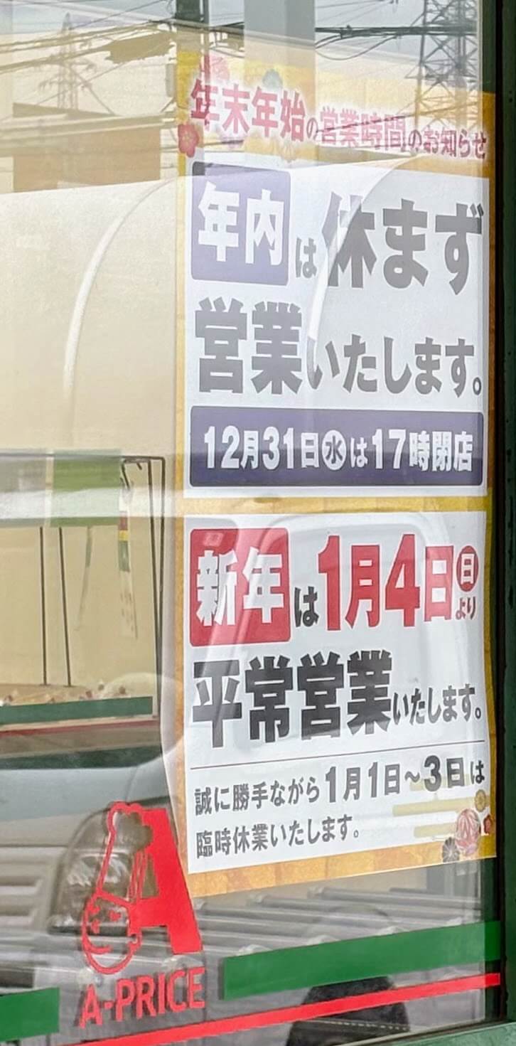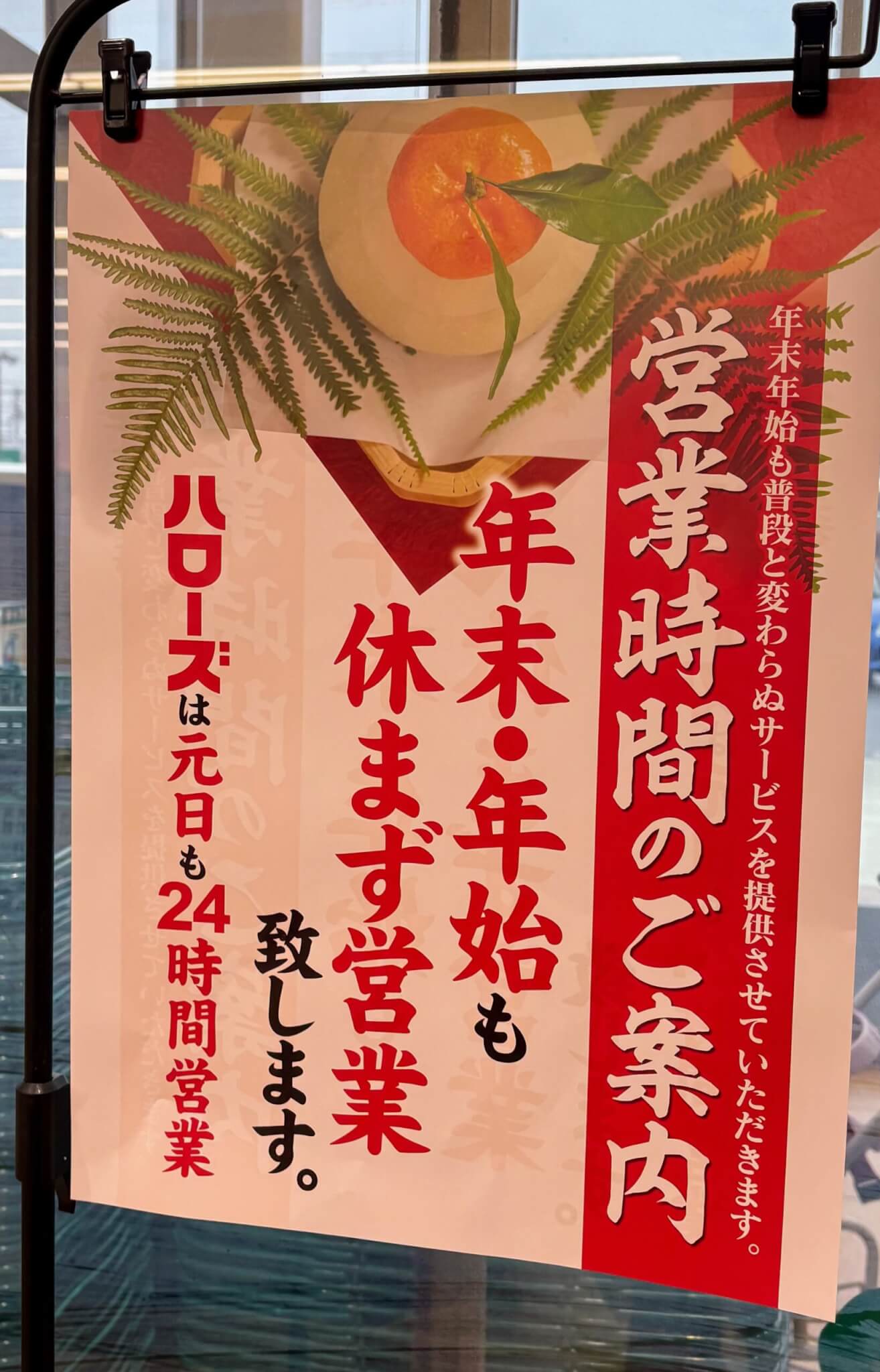 24時間営業ですが、12/31大晦日の21時に一度閉店し、1/1元日は休業、新年初売りは1/2朝9時から。