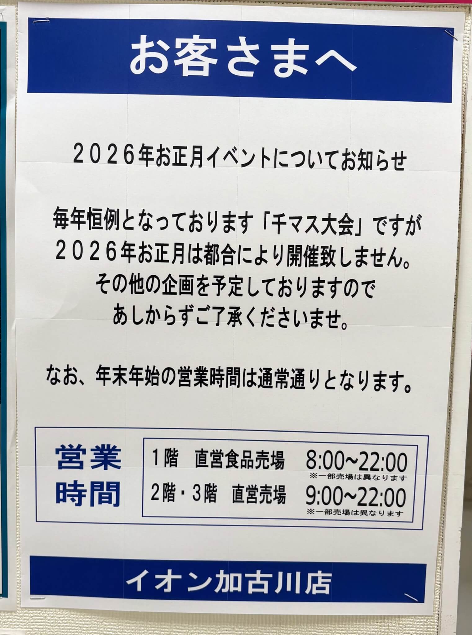 年末年始の営業時間は通常どおりです。毎年恒例の千マス大会は2026年お正月は都合により開催されないそうです。