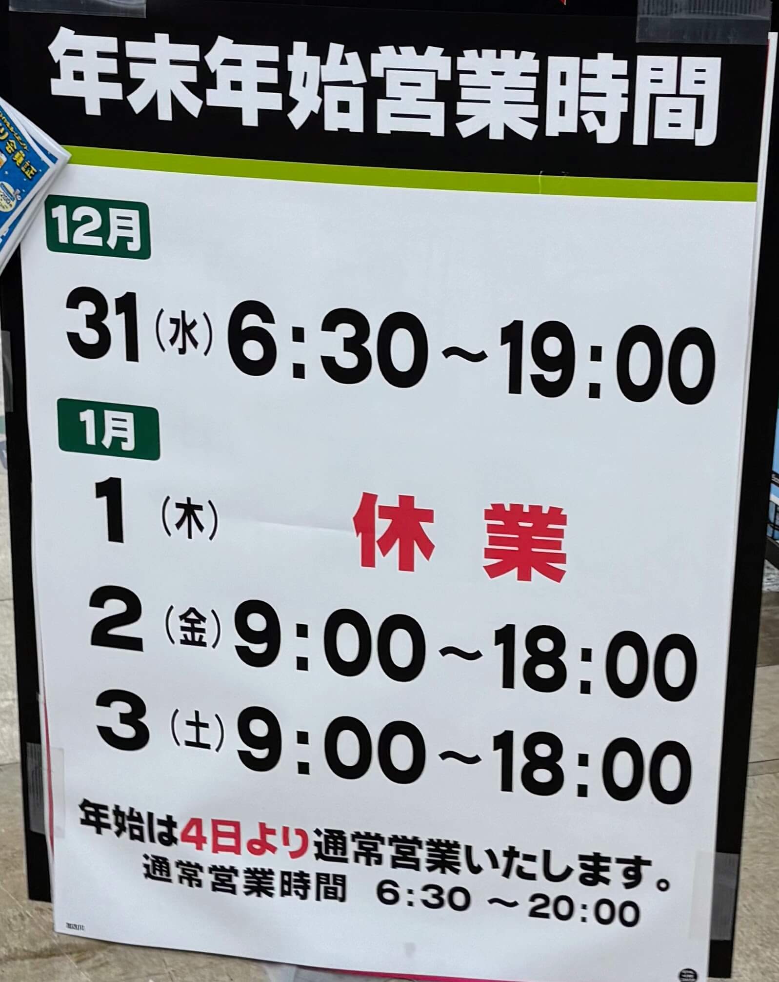 12/31は6:30~19:00。1/1は休業。1/2・1/3は9:00~18:00。1/4より通常営業(6:30~20:00)。