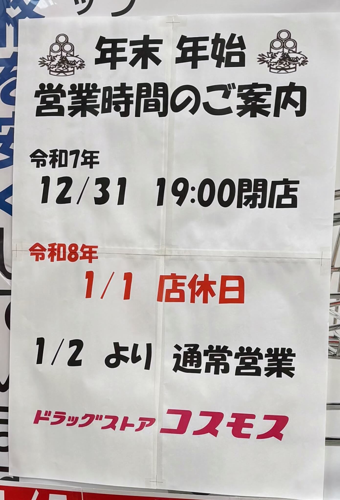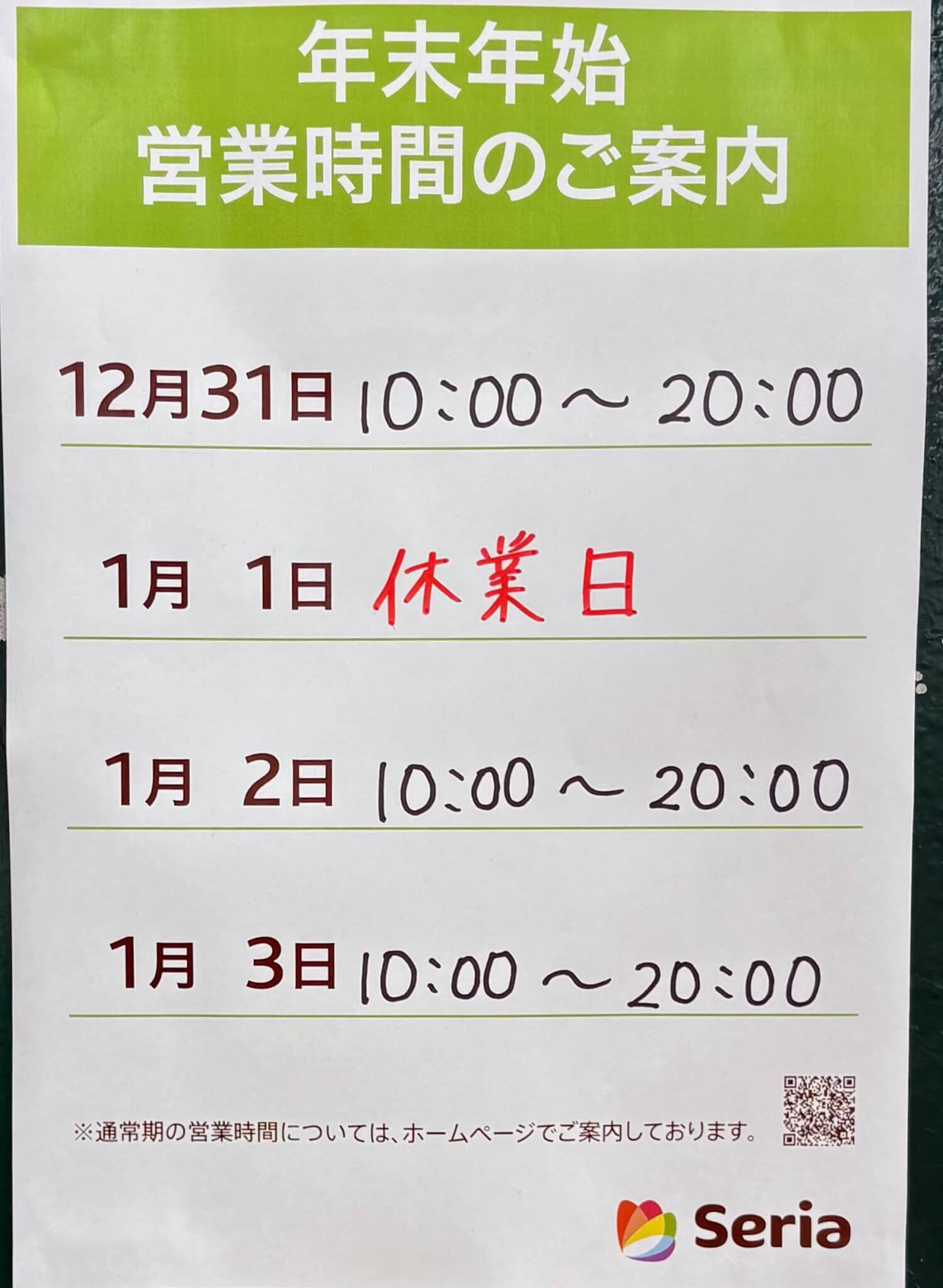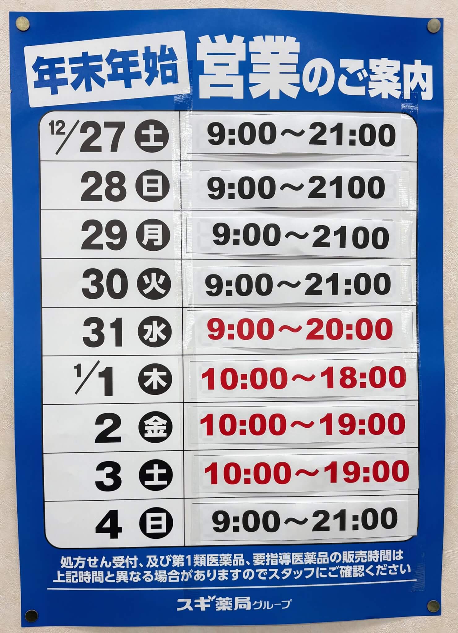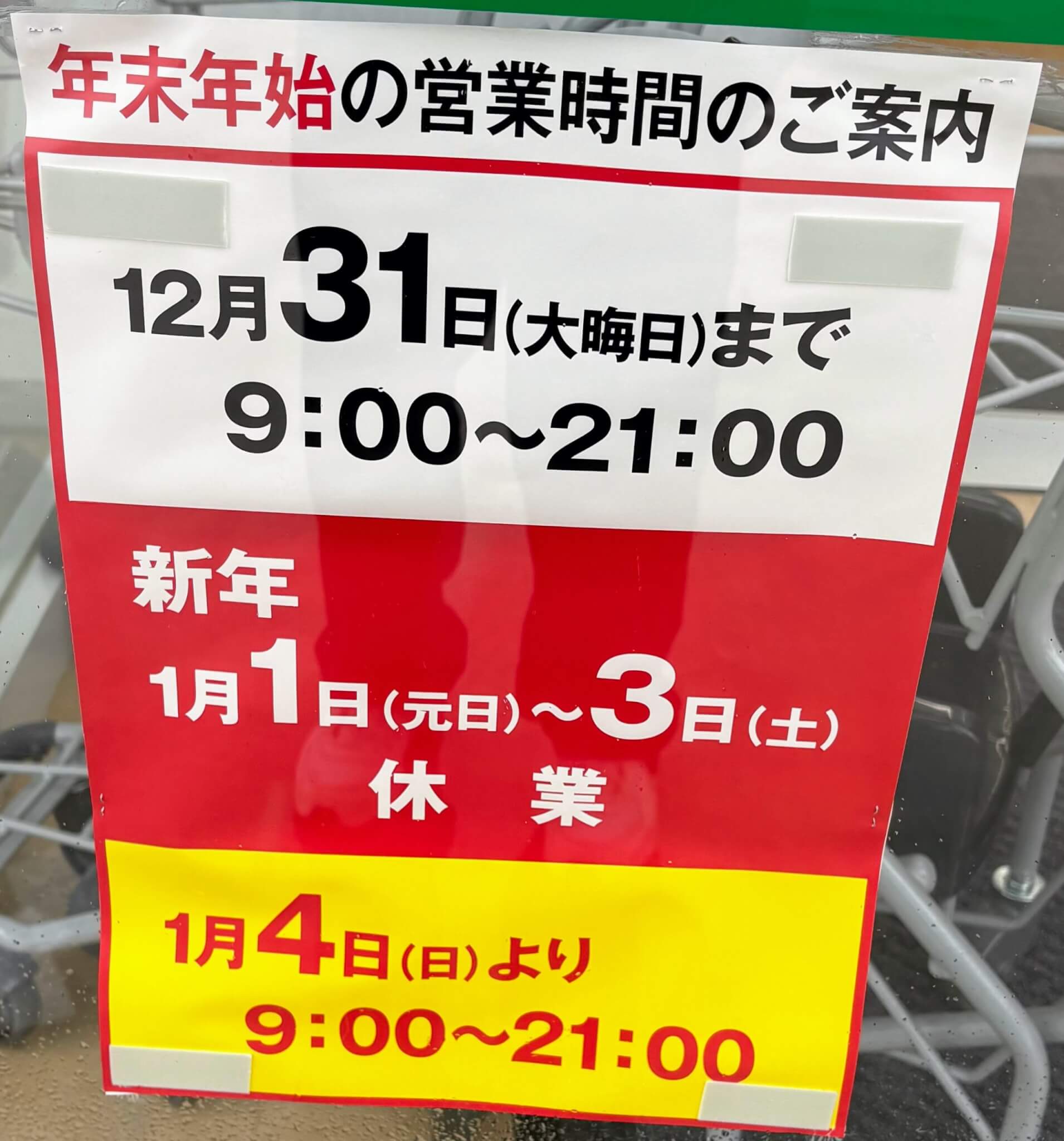 1/1~1/3は店休日。12/31のみ9時〜20時。1/4~通常営業(9時〜21時)。