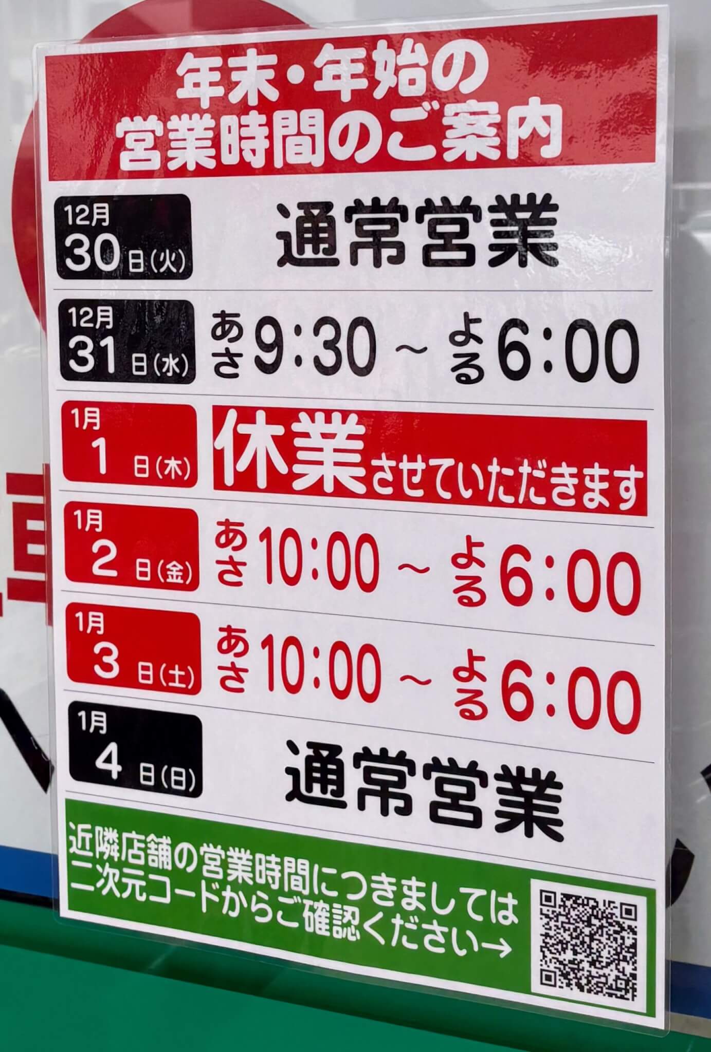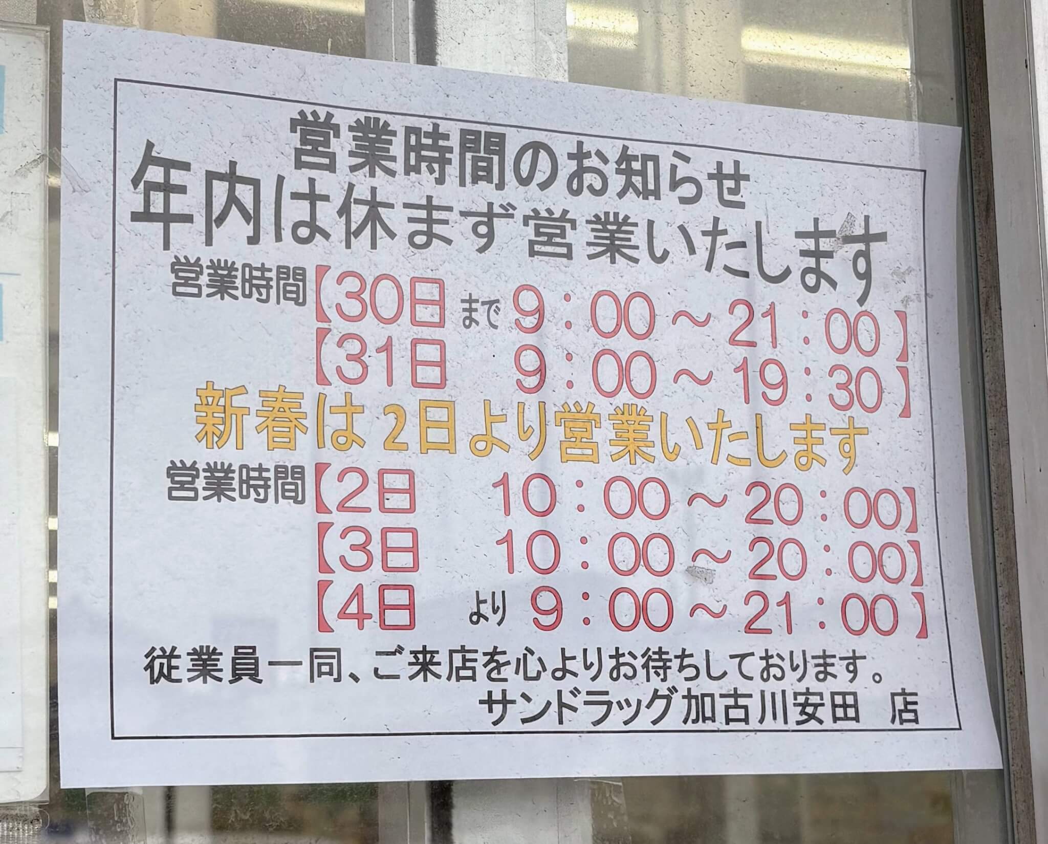 加古川安田店は12/31・1/1・1/2のみ9:00~20:00で通常より2時間早く閉店。