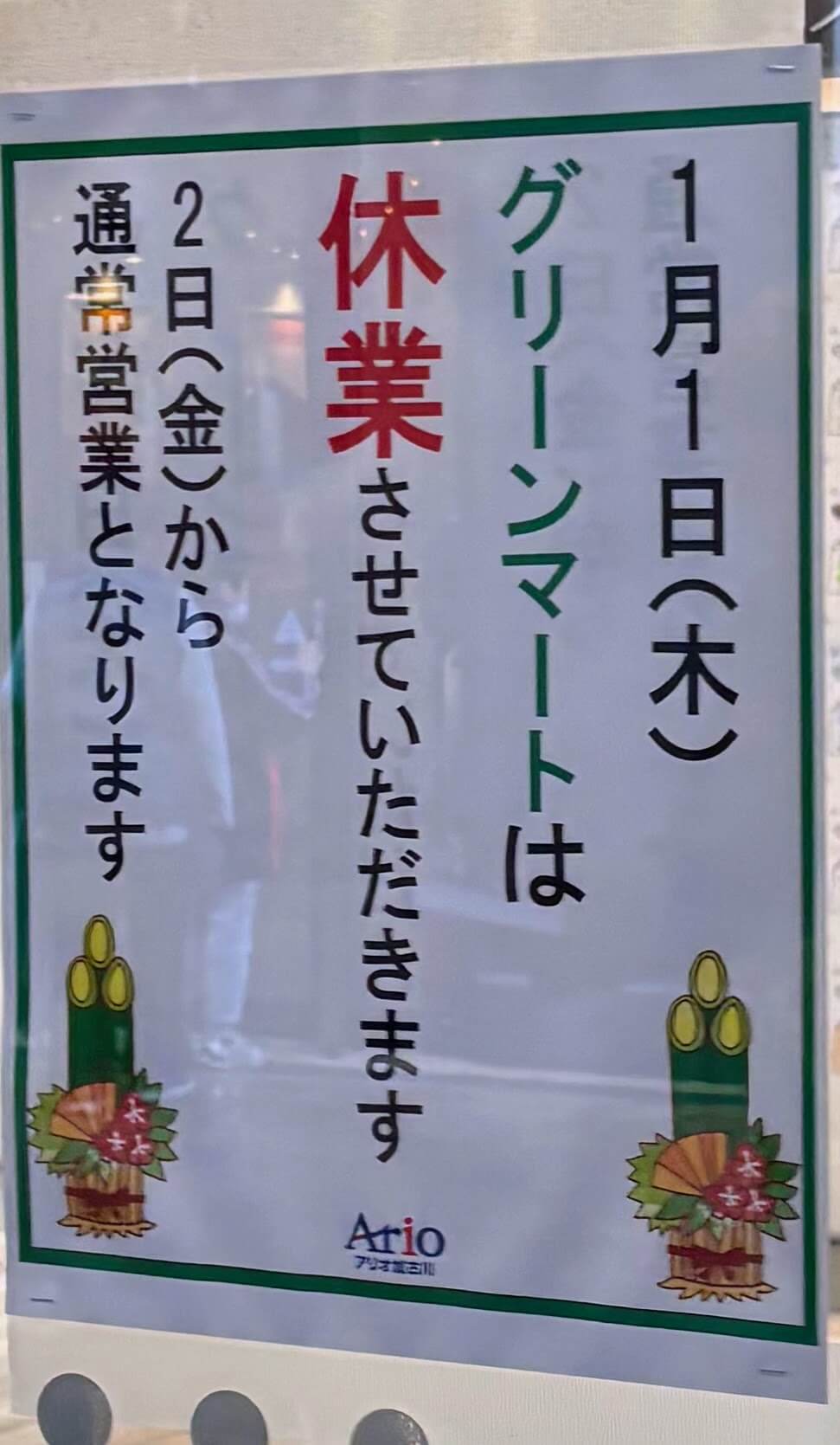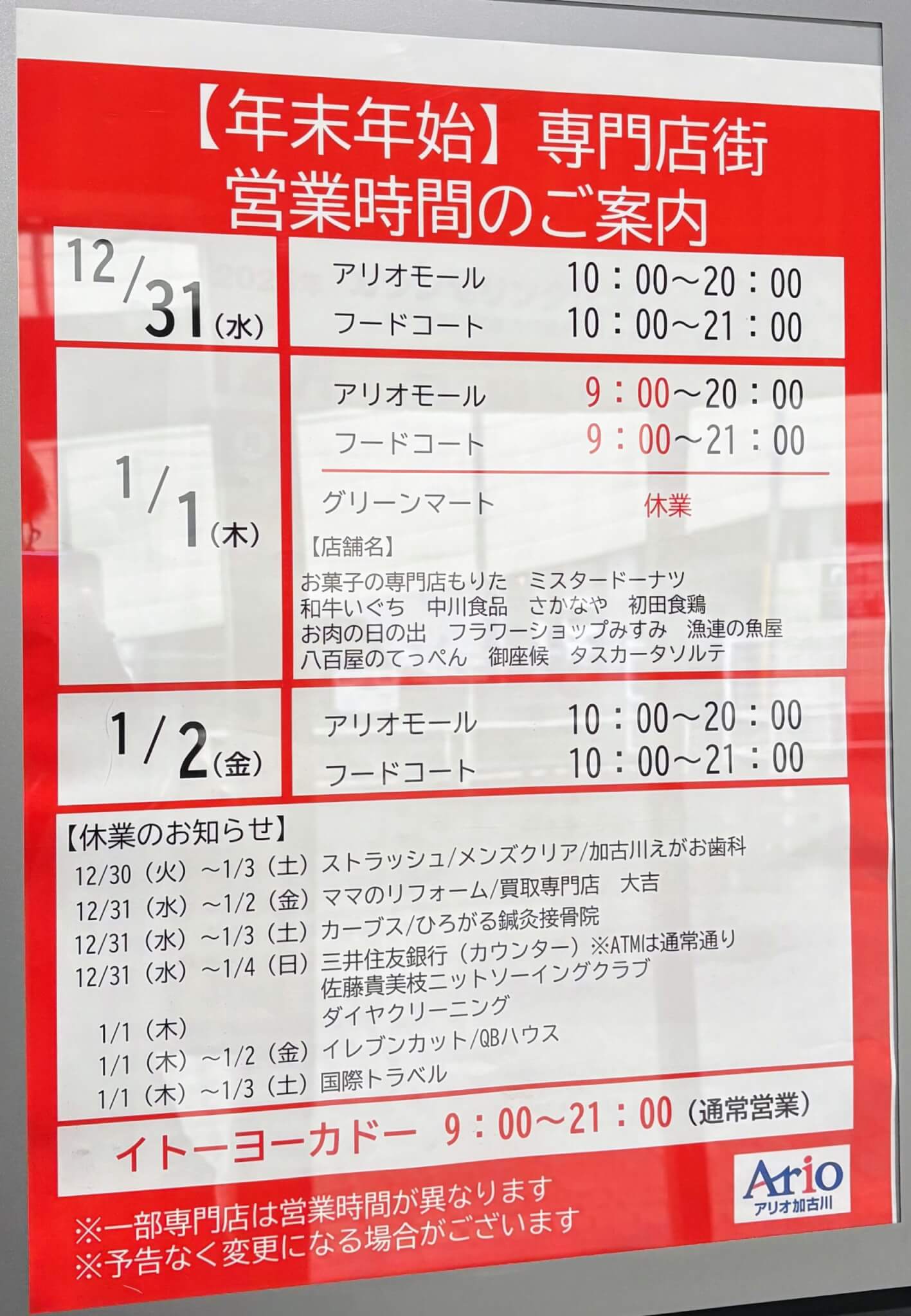 1/1元日のみアリオ加古川は9時開店、グリーンマートは休業となります。初売りですね。休業のお店もあります。