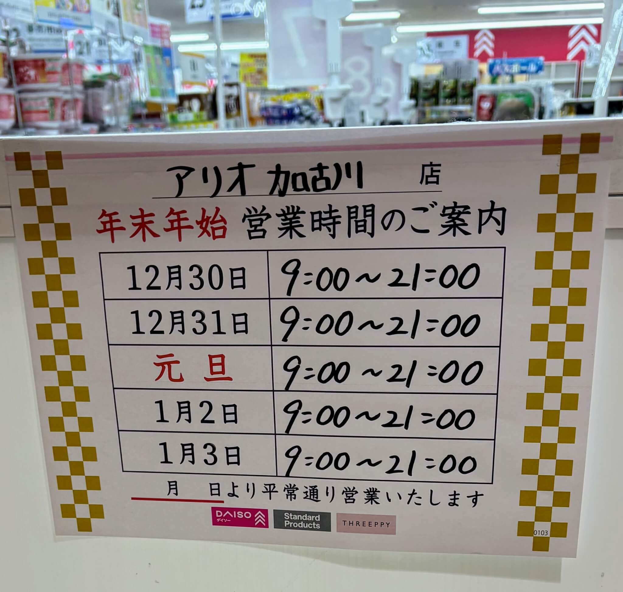 店舗により異なります。DAISOハローズ東加古川店・加古川平岡店・東加古川店は1/1 休業です。営業時間の短縮などは、公式サイトをご確認ください。