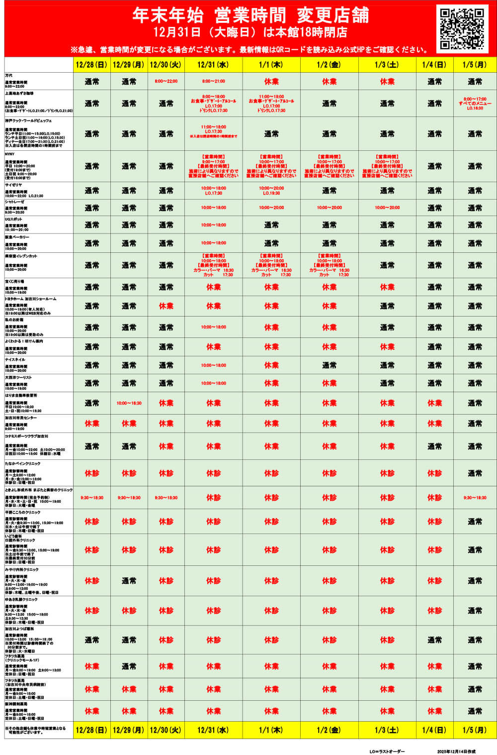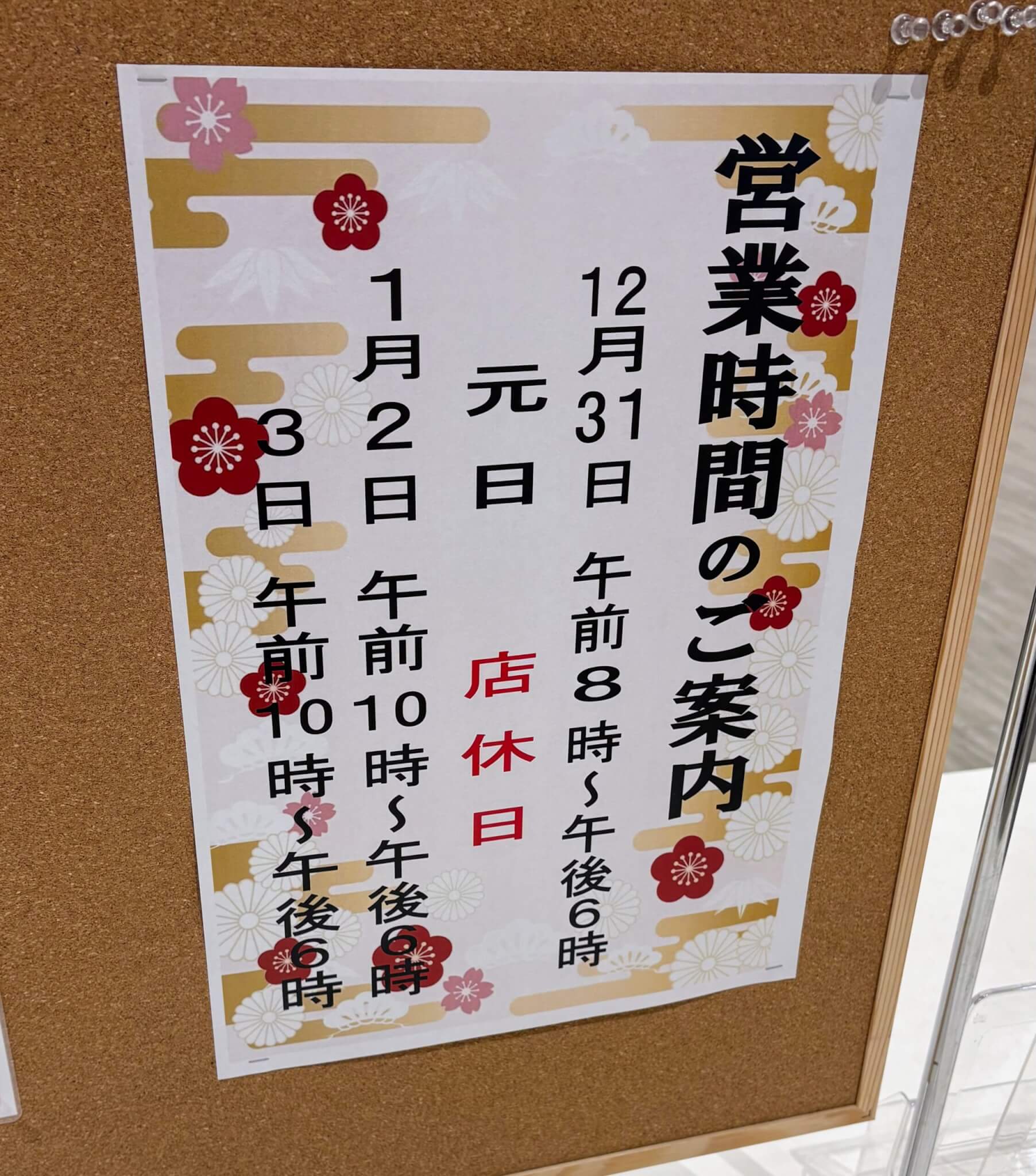 12/31大晦日は19時閉店、1/1・1/2は休業、1/3は10:00~18:00。1/4~通常営業(9:00~21:30)。