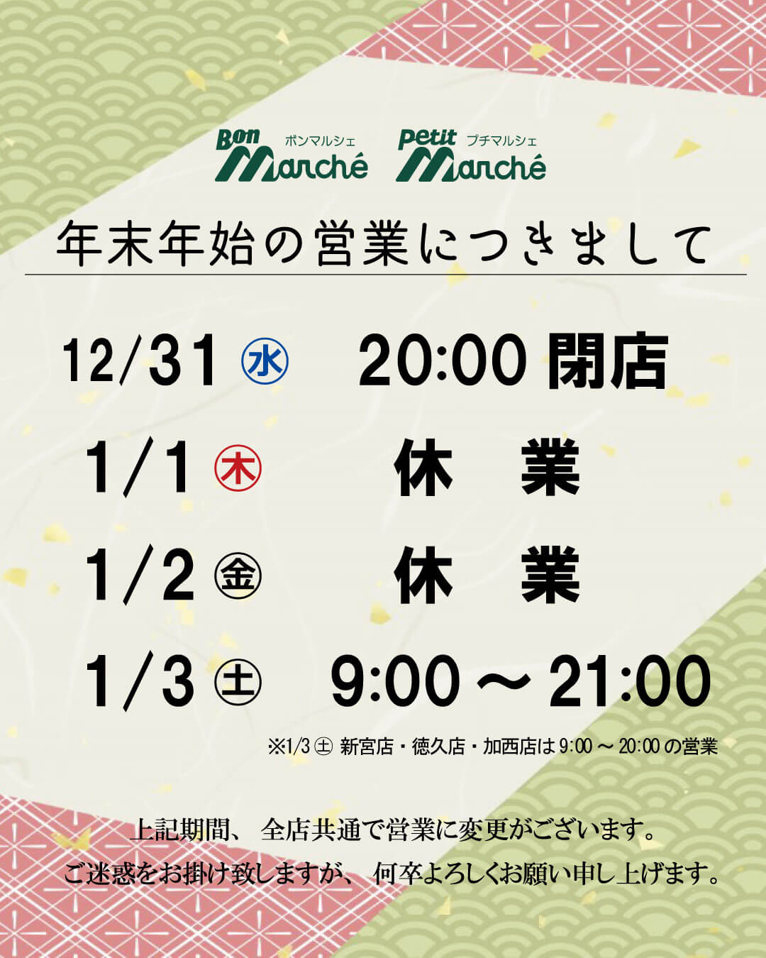 12/31は20時閉店、1/1・1/2休業、1/3より通常営業(9:00〜21:00)。