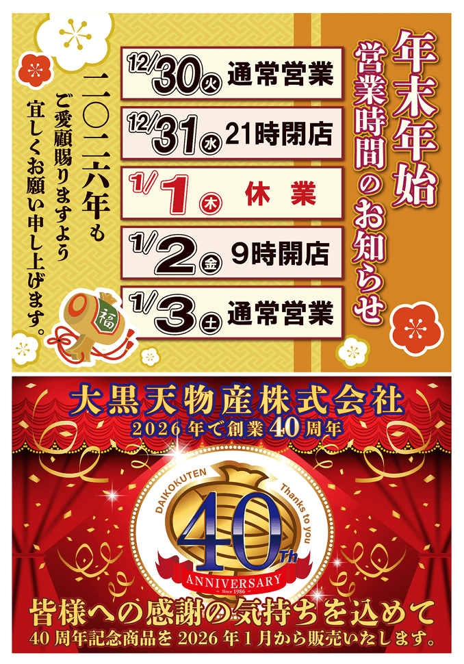 12/31はほぼ18時閉店、1/1・1/2は全館休業、1/3から初売りです!