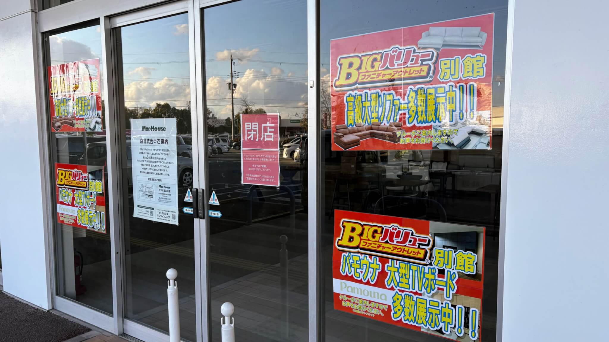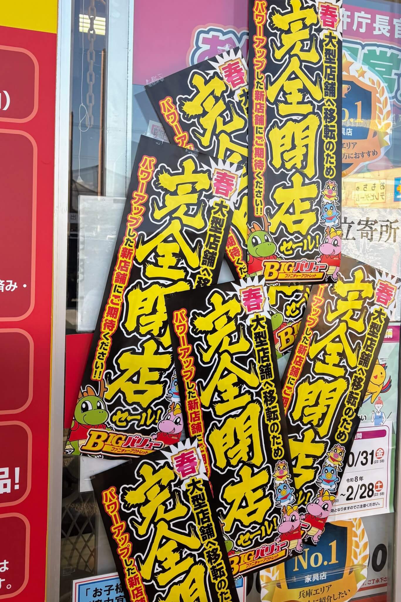 元々マックハウスイオンタウン加古川店(2025年5月閉店)があったところのビッグバリュー別館にも閉店セールのお知らせが出ていました。