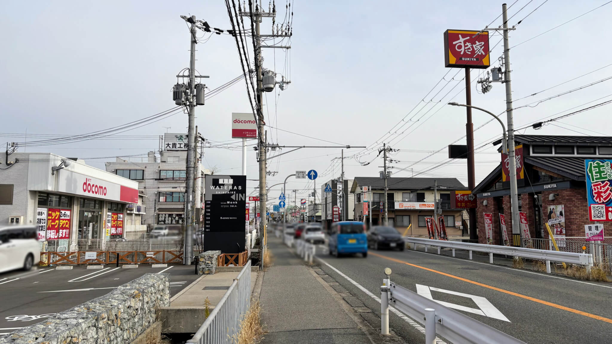南側にはテナントビルのWATERAS SHINZAIKE、ラーメンまこと屋加古川平岡店。