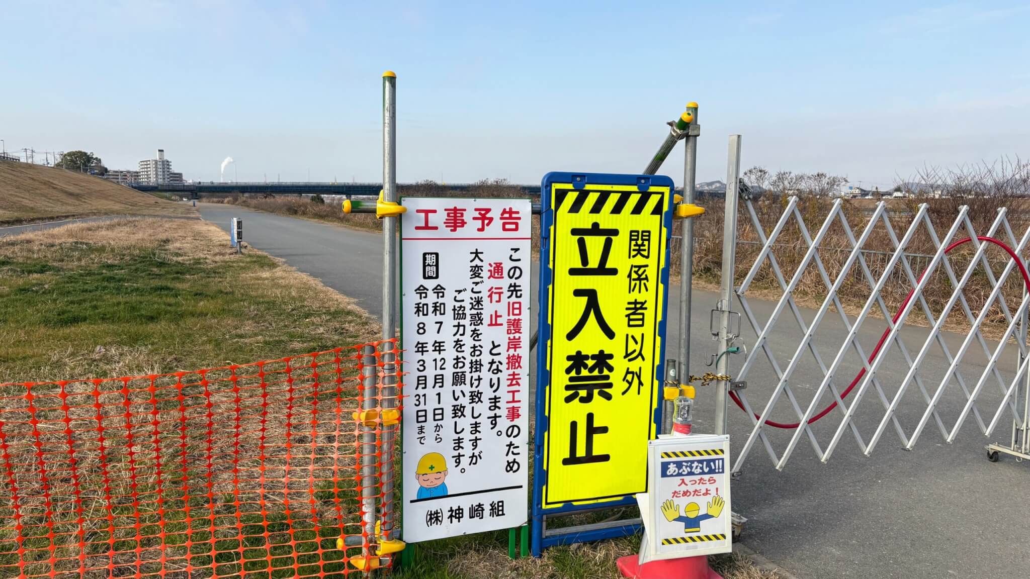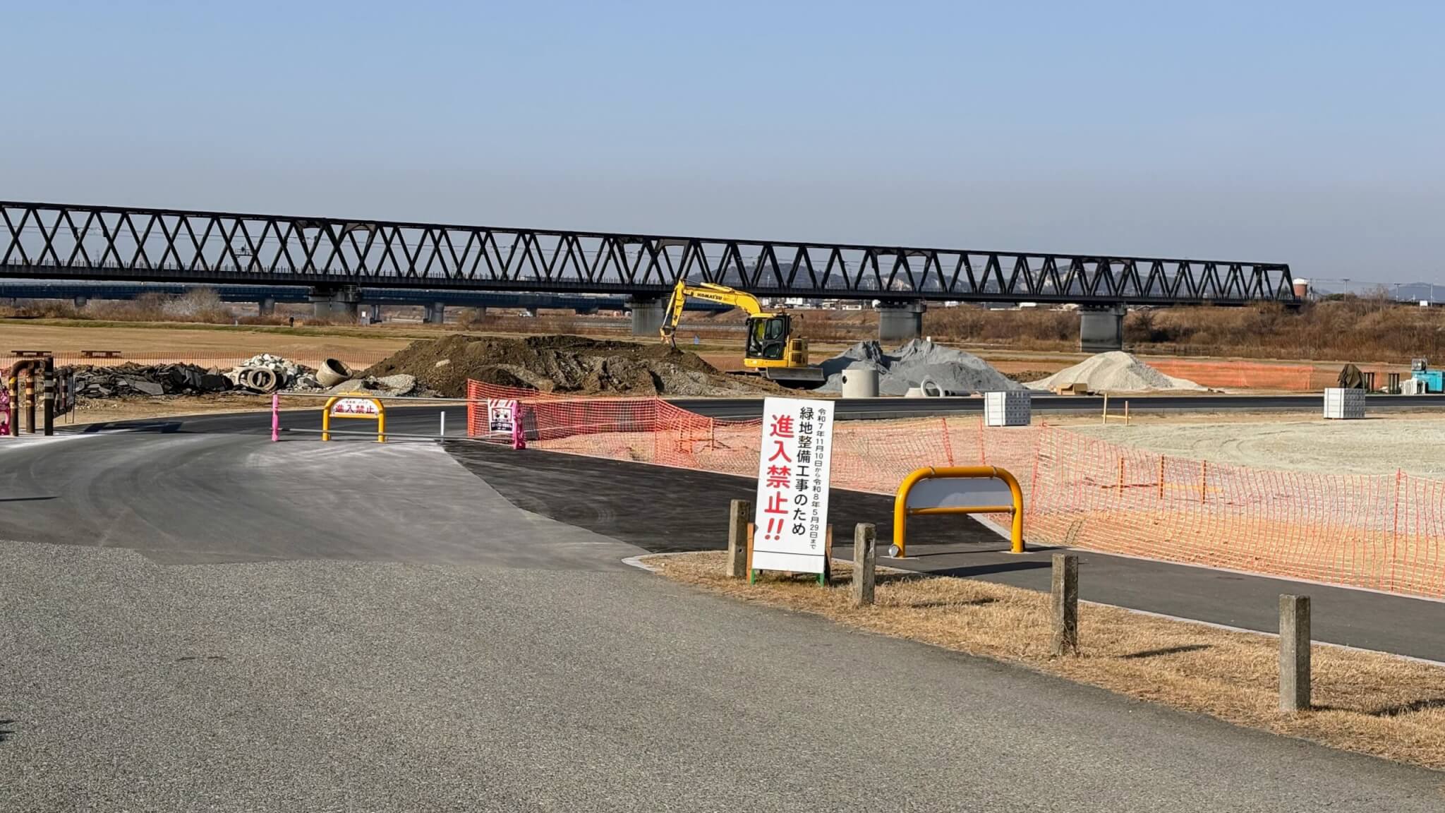 「令和7年11月10日から令和8年5月29日まで緑地整備工事のため進入禁止!!」と看板がありました。5月30日・31日の土日あたりからかわまちづくりイベントがスタートするのかもしれませんね。