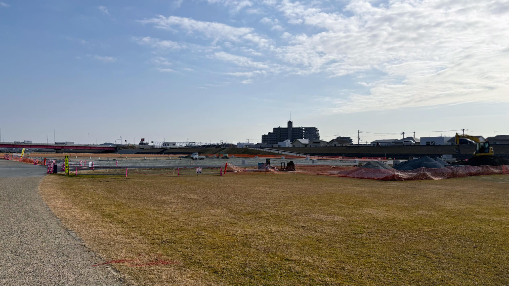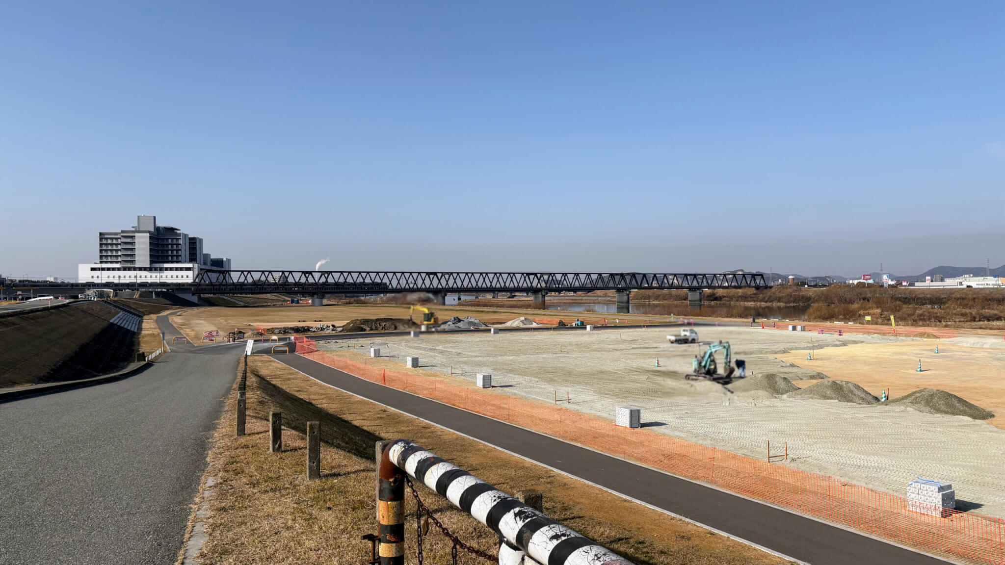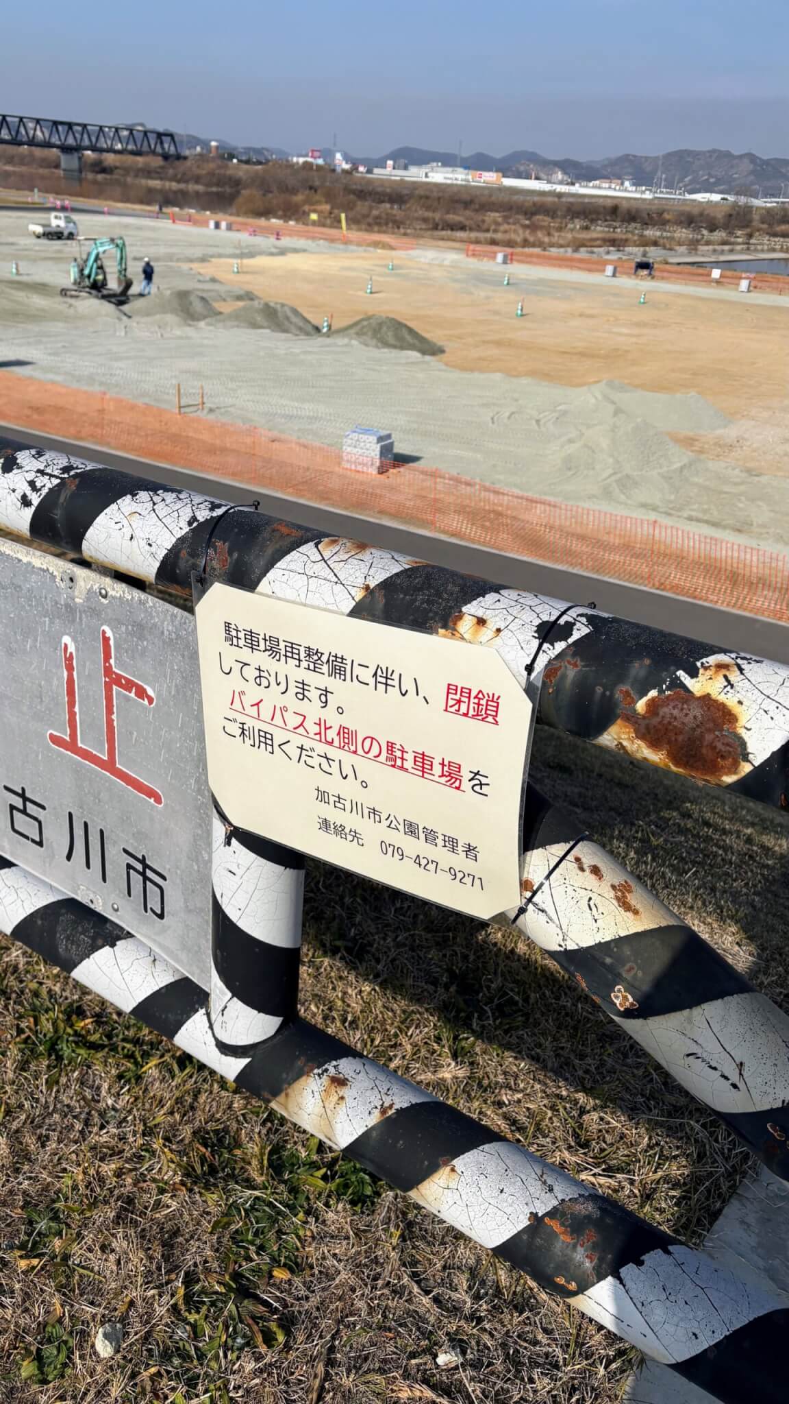 2026年1月19日現在、加古川河川敷でさまざまな工事が同時に進んでいます。