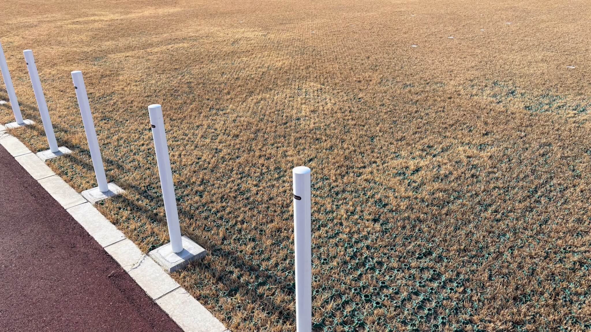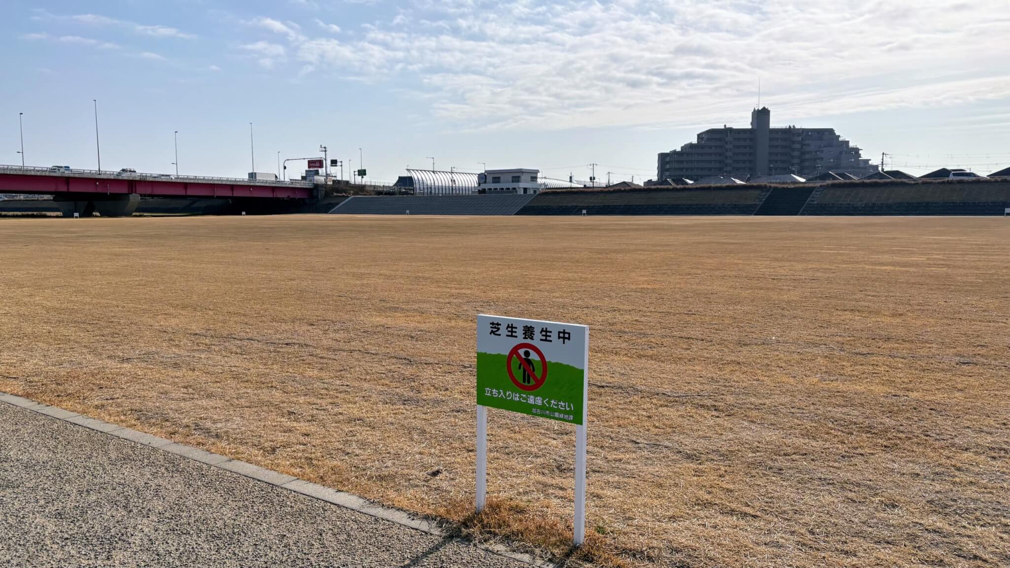 芝生養生中の看板があちこちに建っています。2026年1月19日撮影