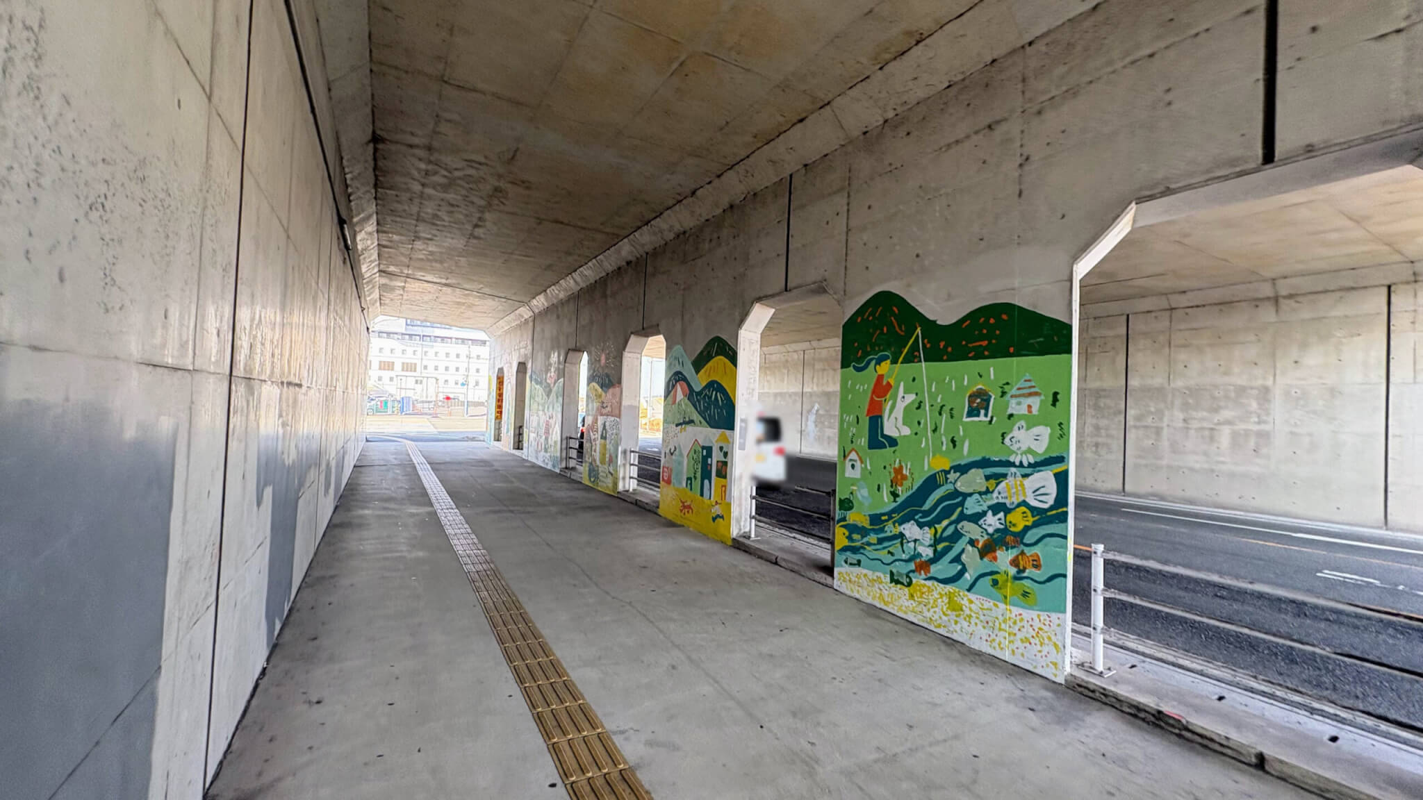 ニッケパークタウンのリバーサイドゾーンの駐車場を出ると、高架下にこどもたちと一緒に描いた壁画が見えてきます。