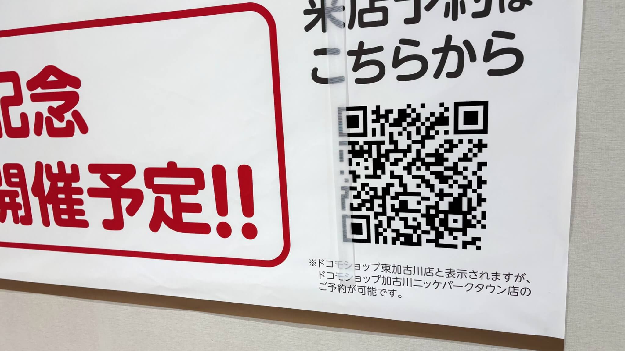 来店予約のQRコードは、ドコモショップ東加古川店につながりますが、ドコモショップ加古川ニッケパークタウン店の予約が可能だそうです。