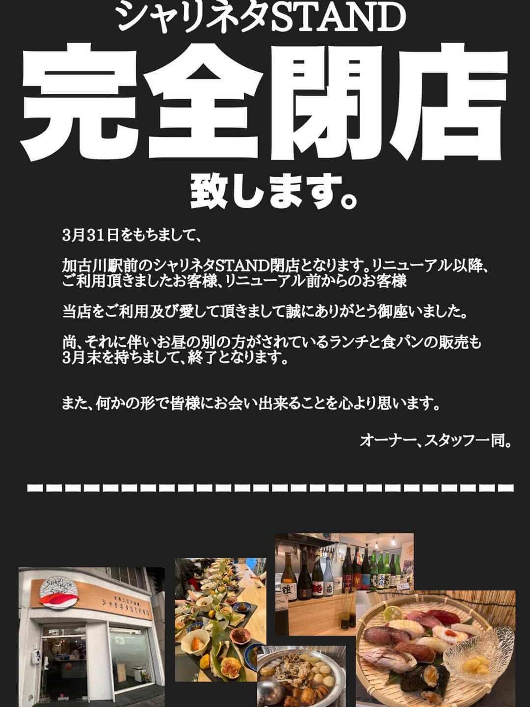 2026年3月31日をもって、加古川駅前ベルデモール商店街にあったシャリネタSTANDが閉店されています。