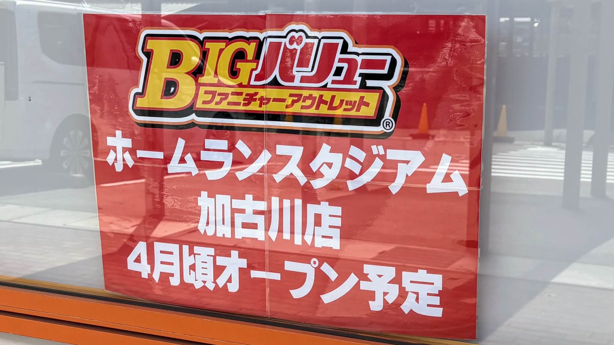 2026年4月18日(土)、明姫幹線の西行き側道沿いに、BIGバリュー ホームランスタジアム加古川店がオープン予定です! 朝10時オープン予定!