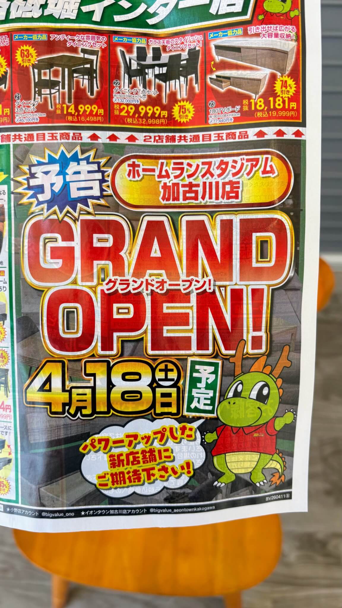 姫路砥堀インター店と小野店のチラシですが、ホームランスタジアム加古川店のオープン情報も掲載されていました!