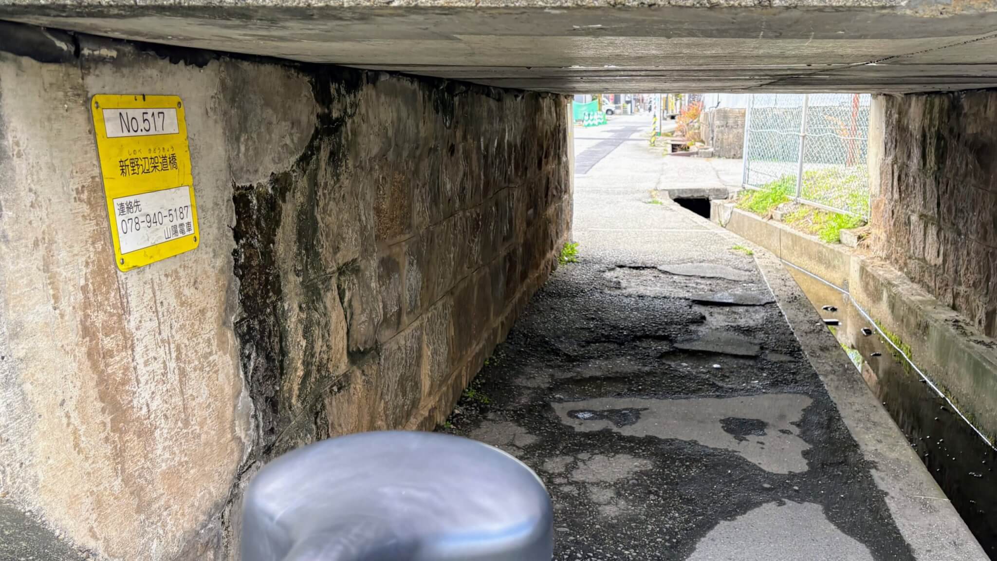 壁には山陽電車の管理プレート「No.517 新野辺架道橋」。ちゃんと番号がついてるんですね。