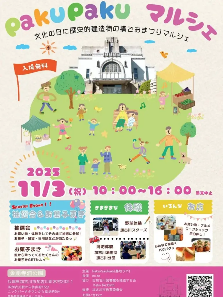 11/3(月・祝)PakuPakuマルシェが旧加古川図書館近くの金剛寺浦公園にて開催!10時から16時まで。2025年11月3日(月・祝)、旧加古川図書館の横にある金剛寺浦公園にて、PakuPakuマルシェが開催されます! 開催時間は10時から16時まで。 歴史的建造物の旧加古川図書... -