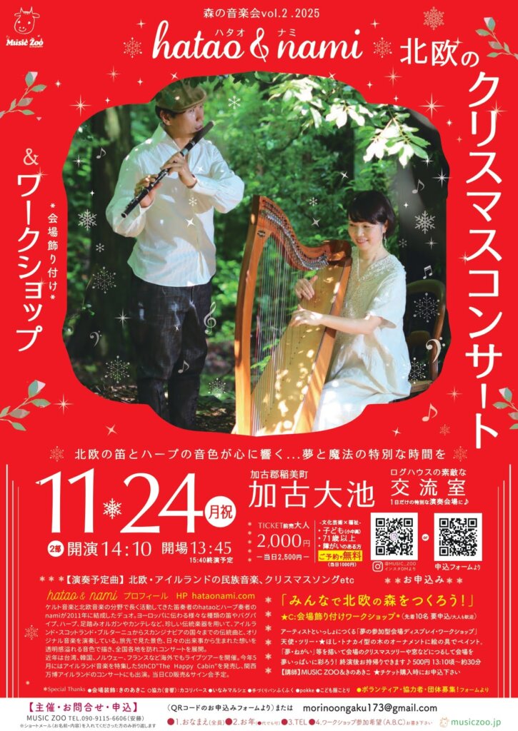 11/24(月・祝)森の音楽会 at 加古大池 vol.2が開催!hatao&nami 北欧のクリスマスコンサート&ワークショップ!2025年11月24日(月・祝)、稲美町の加古大池 交流室(ログハウス管理棟内)にて、森の音楽会 at 加古大池 vol.2 hatao&nami 北欧のクリスマスコンサート&ワー... -