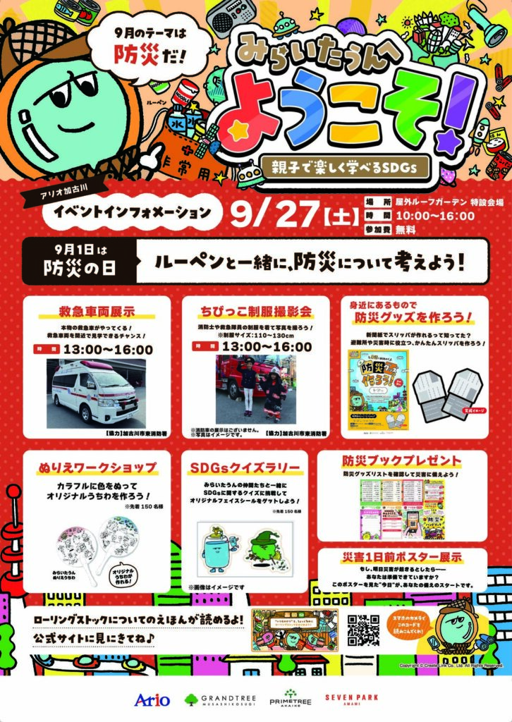 9/27(土)みらいたうんへようこそ! ~親子で楽しく学べるSDGs~がアリオ加古川にて開催!テーマは防災!2025年9月27日(土)、アリオ加古川の屋外ルーフガーデン特設会場にて、みらいたうんへようこそ! ~親子で楽しく学べるSDGs~が開催されます! 開催時間は午前10時か... -