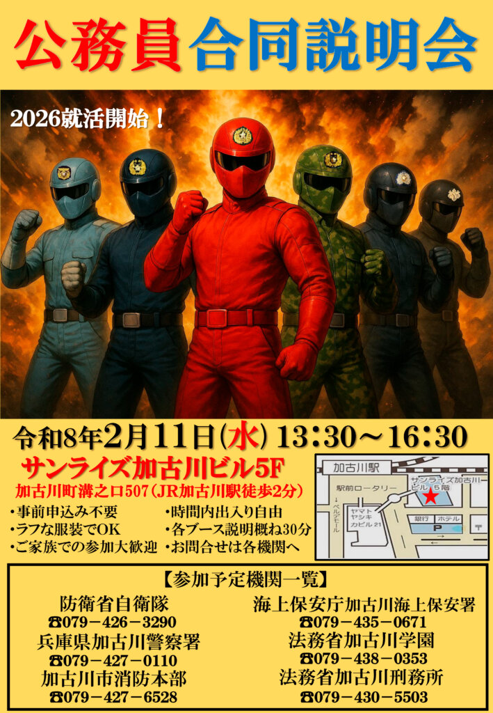 2/11(水・祝)公務員合同説明会がサンライズ加古川ビル5Fで開催!【自衛隊・警察署・消防署・海上保安署・加古川学園・加古川刑務所が参加】2026年2月11日(水・祝)、JR加古川駅近くのサンライズ加古川ビル5Fにて、公務員合同説明会が開催されます! 開催時間は13時半から16時半まで。 事前申込不要、途中参... -
