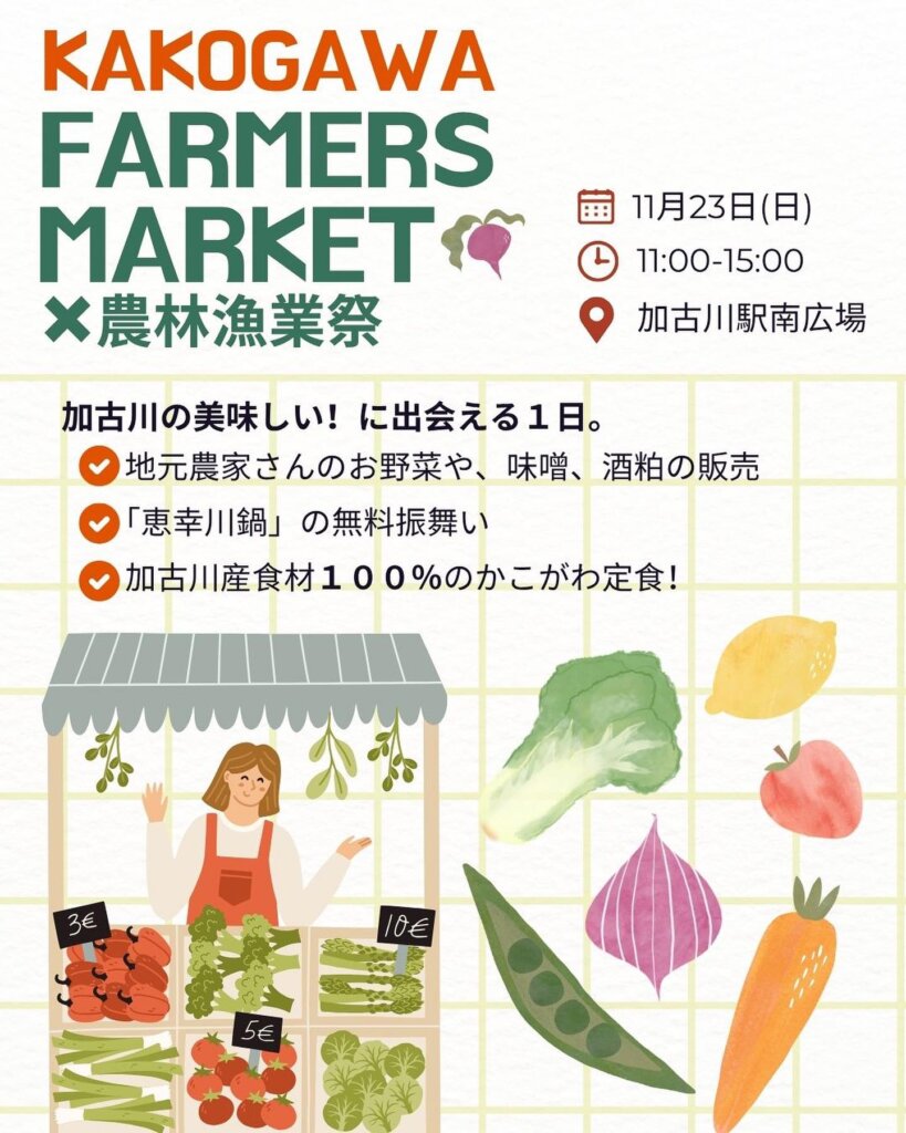 2025年11月23日(日)、JR加古川駅南広場にて、加古川ファーマーズマーケット×農林漁業祭が開催されます! 開催時間は11時から15時まで。 加古川の美味しい!に出会え...