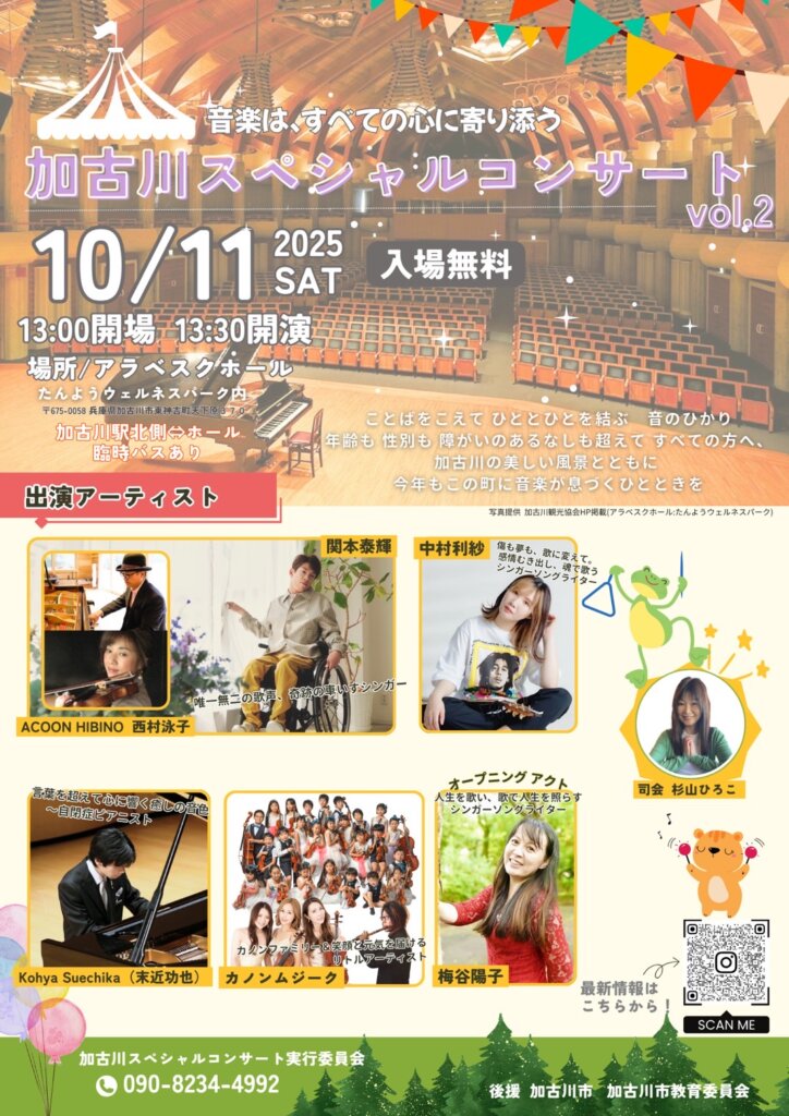 10/11(土)加古川スペシャルコンサートVol.2がアラベスクホール(ウェルネスパーク)にて開催!13時半開演!2025年10月11日(土)、たんようウェルネスパーク(加古川ウェルネスパーク)のアラベスクホールにて、加古川スペシャルコンサートVol.2が開催されます! 13時開場、13... -