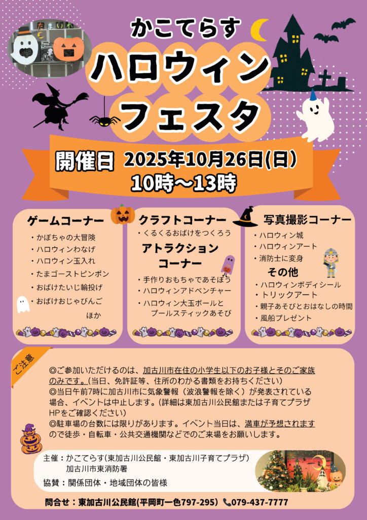 10/26(日)かこてらすハロウィンフェスタ2025が開催!10時から13時まで【加古川市在住の小学生以下のお子様と家族対象】2025年10月26日(日)、東加古川のかこてらすにて、かこてらすハロウィンフェスタ2025が開催されます! 開催時間は10時から13時まで。 事前予約不要ですが、加古川市在... -