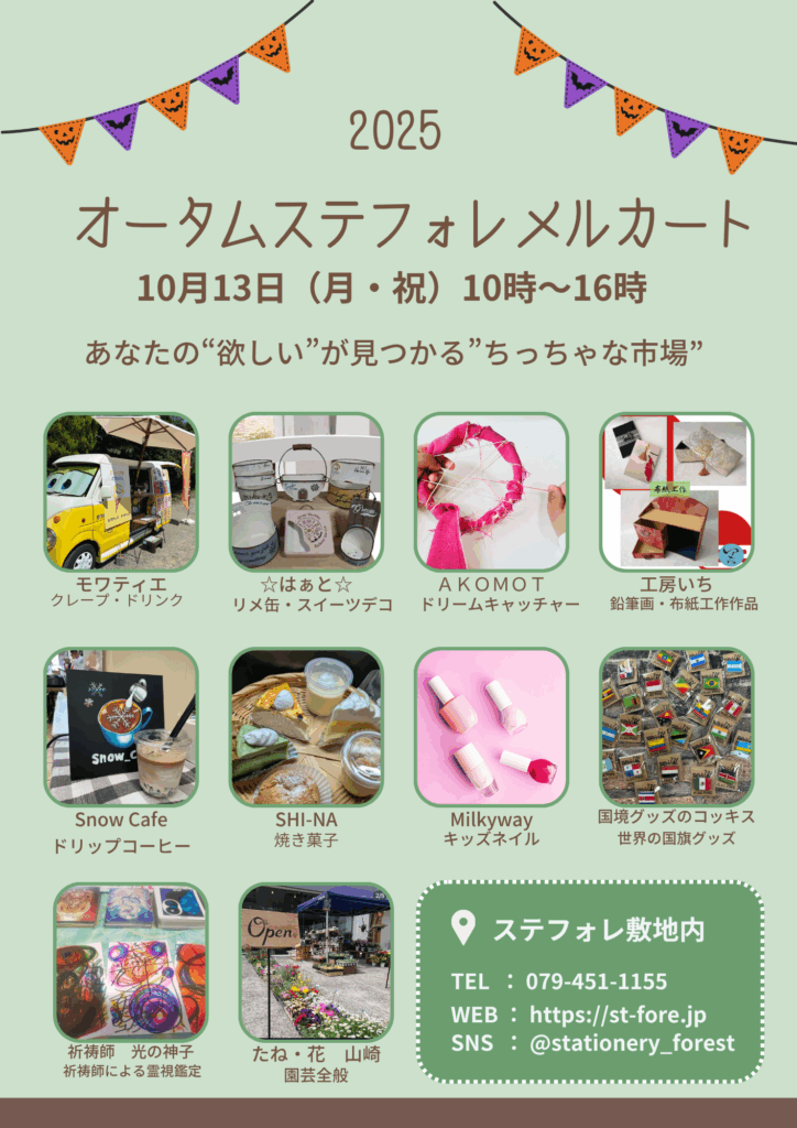10/13(月・祝)2025オータムステフォレメルカートが北在家のステフォレ敷地内で開催!2025年10月13日(月・祝)、加古川町北在家の文具店ステフォレ敷地内にて、2025オータムステフォレメルカートが開催されます! 開催時間は10時から16時まで。 あなたの... -