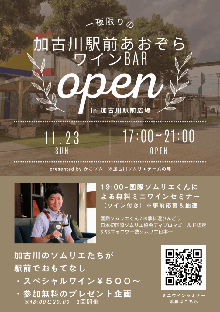 11/23(日)一夜限りの加古川駅前あおぞらワインBARが加古川駅南広場にて開催!国際ソムリエくん&かこソム主催!2025年11月23日(日)、JR加古川駅南広場にて、一夜限りの加古川駅前あおぞらワインBARが開催されます! 開催時間は17時から21時まで。 国際ソムリエくん(@ryuta_buzz... -