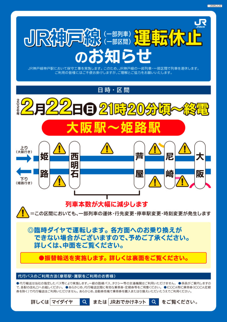 2/22(日)の夜、JR神戸線「姫路駅~大阪駅」の区間で工事のため列車の運転休止予定【21:20頃~最終列車まで】2026年2月22日(日)、JR神戸線の「姫路駅~大阪駅」の区間で、大規模な保守工事に伴い、一部の列車に運転休止があるとJR西日本から発表されています! 加古川駅、東加... -