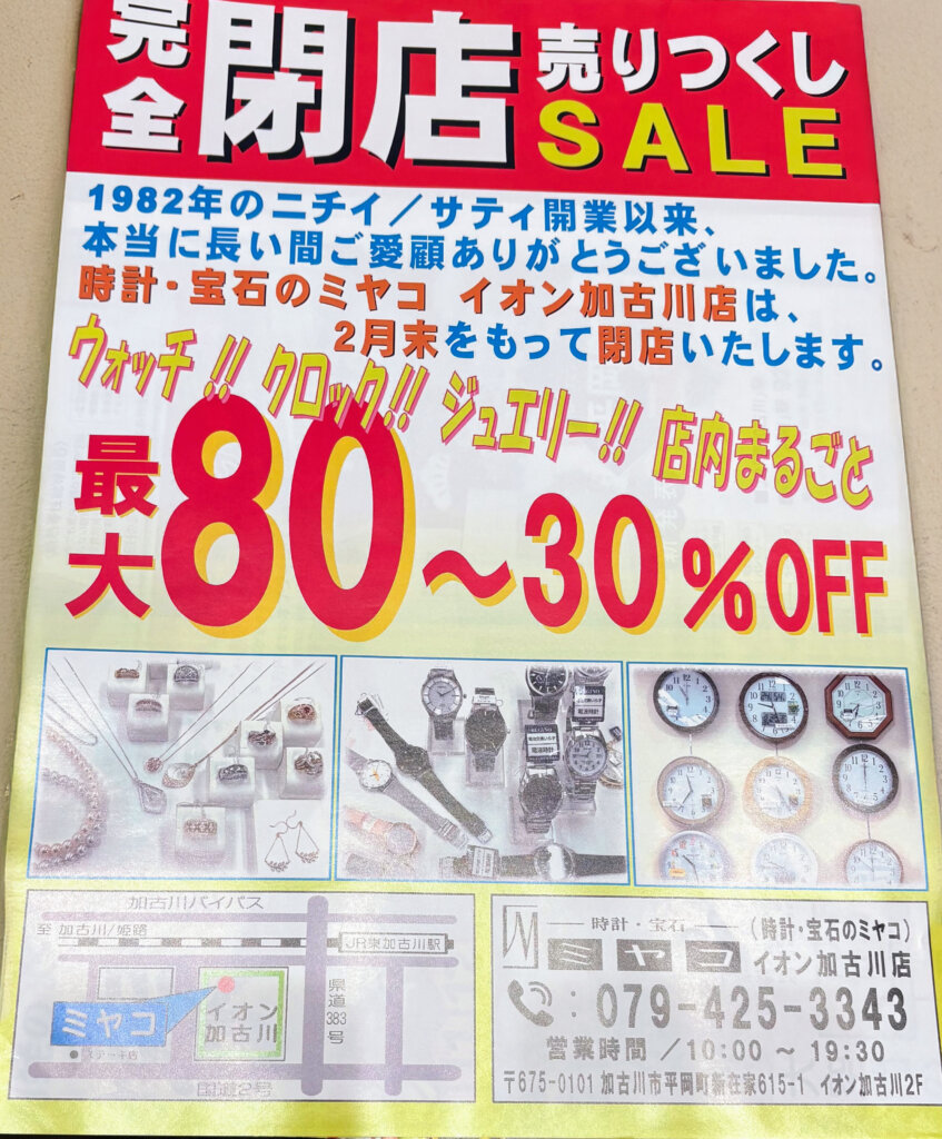 【閉店】時計・宝石のミヤコ イオン加古川店が2026年2月末をもって閉店予定。閉店売り尽くしセール開催中。2026年2月28日(土)をもって、イオン加古川店2階の時計・宝石のミヤコ イオン加古川店が閉店します。 それに伴い、現在、閉店売り尽くしセール開催中です。 完全閉店売... -